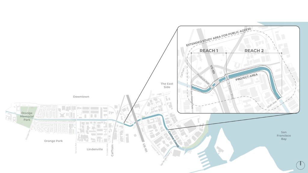 The Lower Colma Creek Resilience Projects are being planned to reduce sea level rise and flooding risks, improve public safety, and expand opportunities for open space along Colma Creek from San Mateo Avenue to Utah Avenue in South San Francisco. This section of the Creek was identified as a high priority area due to the condition of the infrastructure and opportunities informed by previous plans and studies. Currently this process is expected to result in multiple projects that may be phased for expedient implementation.