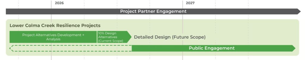 The current phase of this project is funded through contributions from members of the Colma Creek Flood Zone (South San Francisco, Colma, Daly City, San Bruno, and Pacifica). Projects developed are expected to result in multiple benefits eligible for funding from diverse sources.